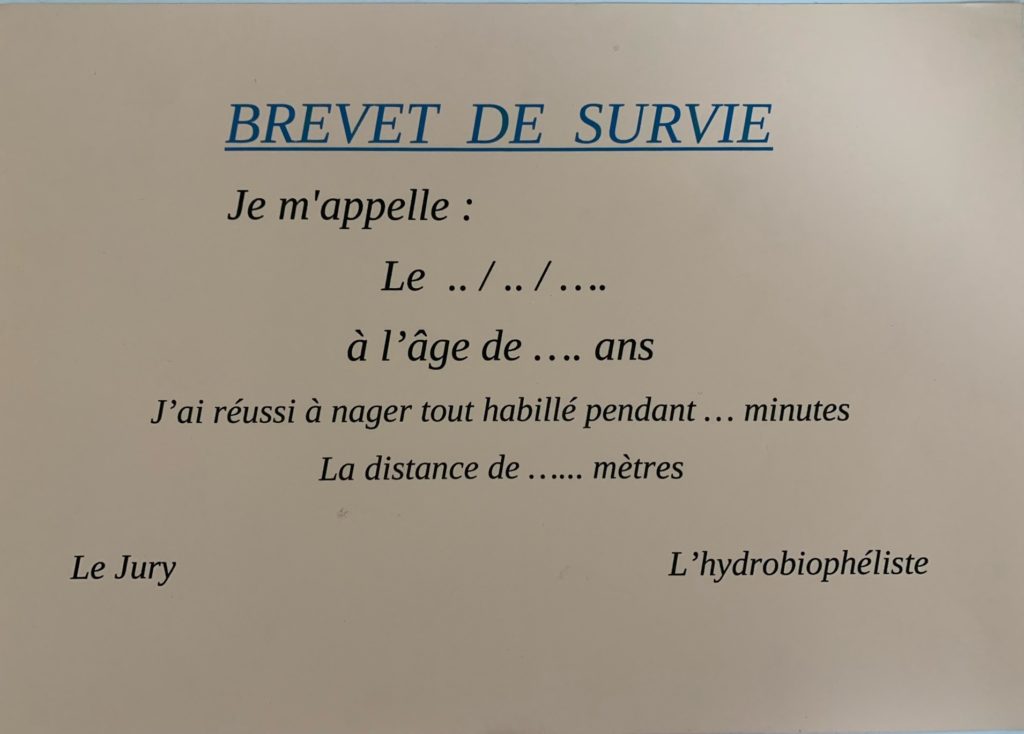 Le Brevet de survie peut être réalisé à tout moment, le but est de nager habillé pendant le temps que l'on peut et la distance que l'on peut.